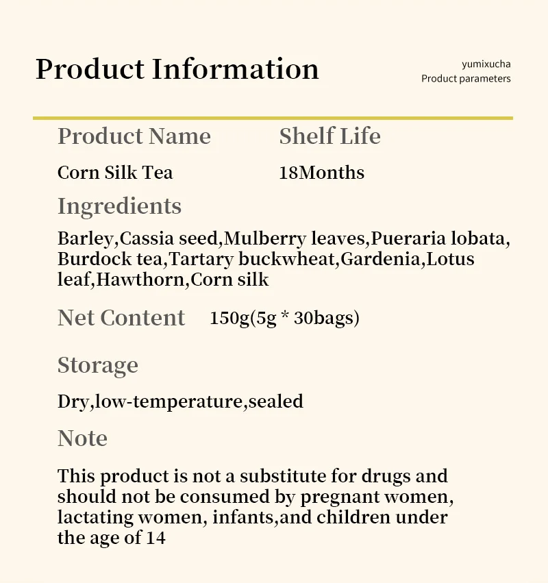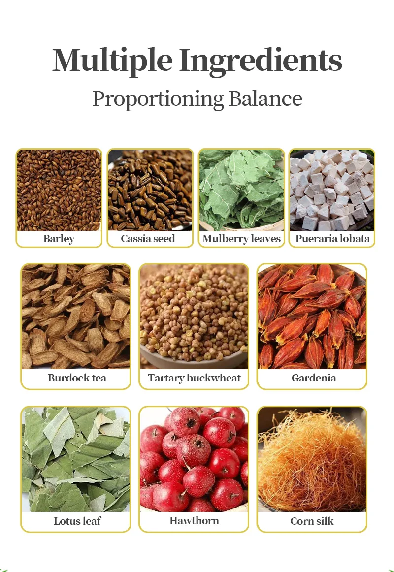Barley,Cassia seed,Mulberry leaves,Pueraria lobata,Burdock tea,Tartary buckwheat,Gardenia,Lotus leaf,Hawthorn,Corn silk