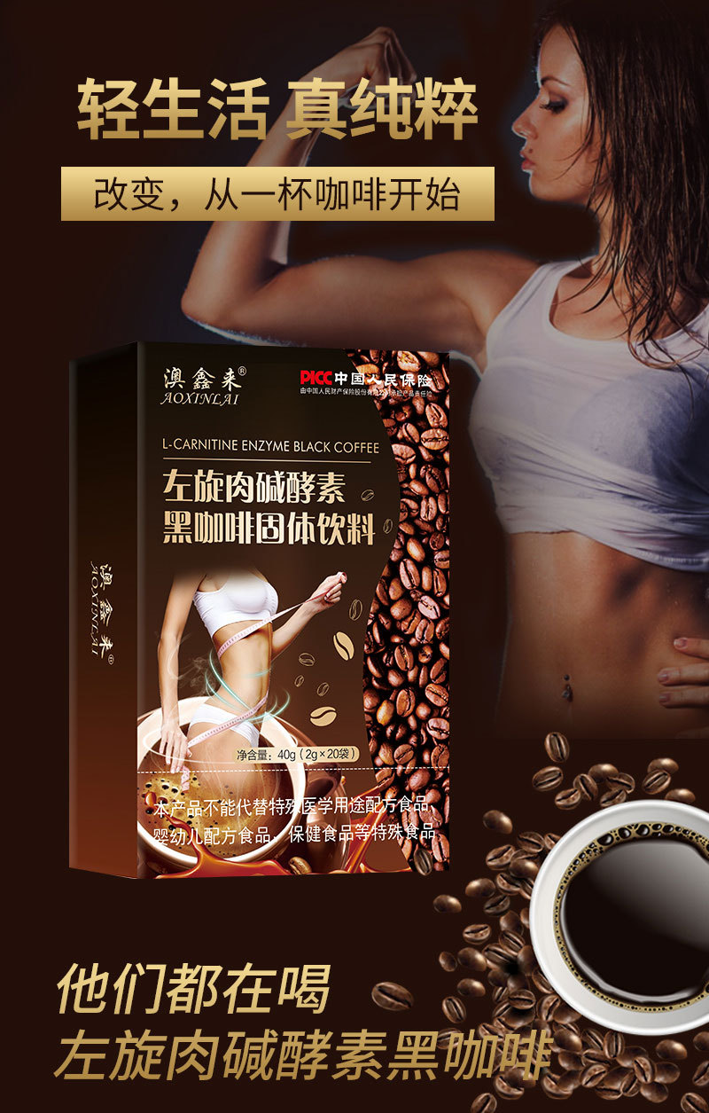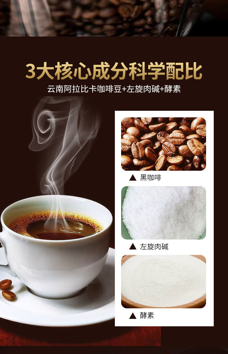 Raw materials and ingredients: coffee powder Fruit and vegetable enzyme powder L-carnitine